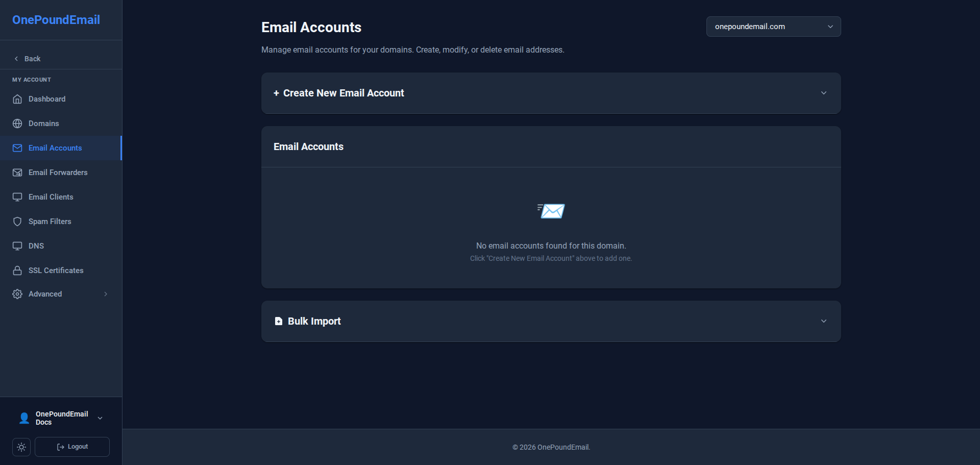 Make sure you have at least one domain added to your account before creating an email address. If you haven't done this yet, follow the Quick Setup Guide first.